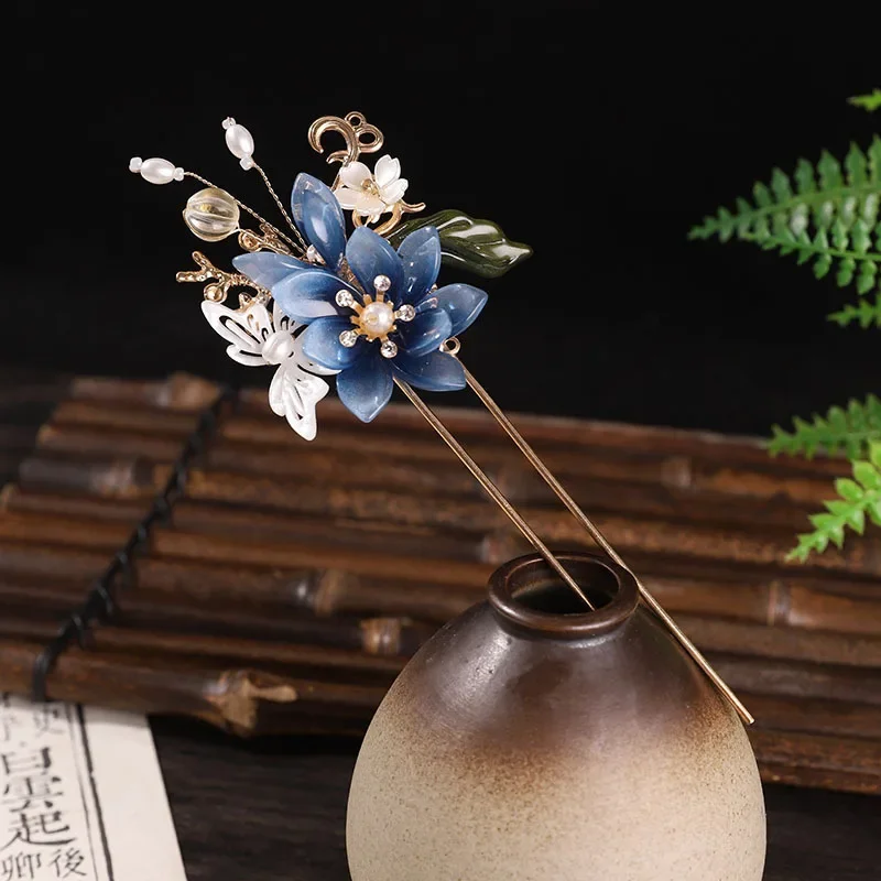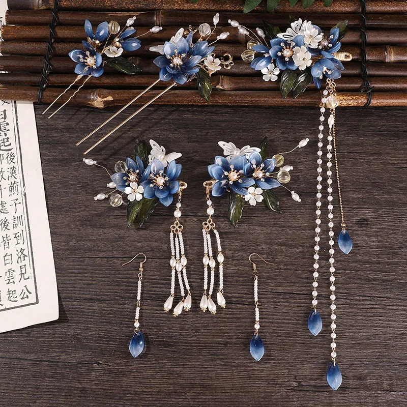 This Luxury Hair Clip features a blue flower design with pearl accents and a long tassel, inspired by traditional Chinese Hanfu style. Perfect as a hair stick or chopstick accessory, it adds elegance and vintage charm to any hairstyle for special occasions or daily wear.